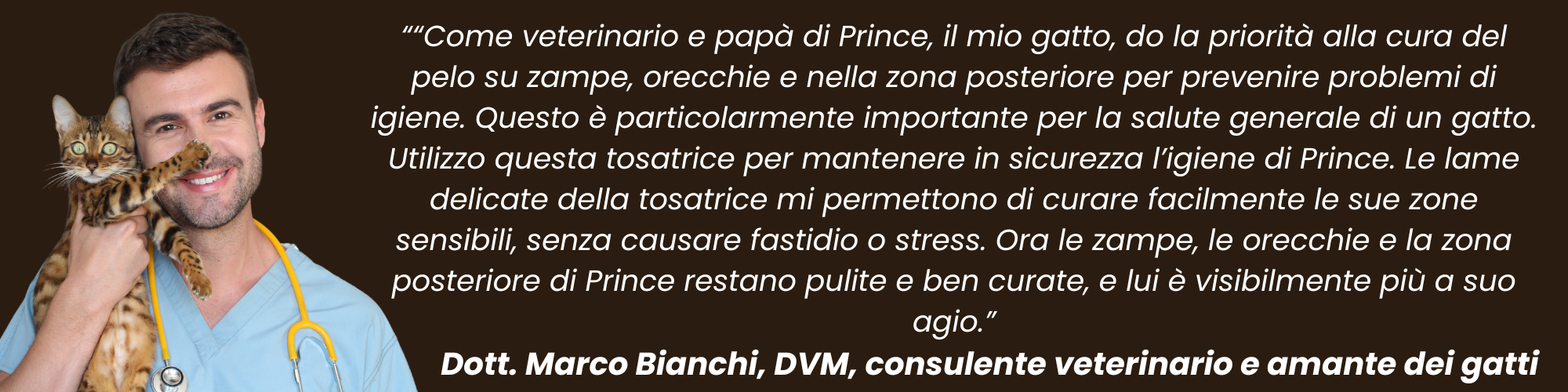 "Il mio Maine Coon soffriva di frequenti infezioni alle orecchie a causa del pelo troppo lungo. Questa tosatrice mi ha permesso di accorciare delicatamente il pelo intorno alle orecchie senza irritazioni. Le lame precise e il motore silenzioso lo mantengono calmo, e le sue orecchie sono molto piรน pulite da allora. Niente piรน infezioni!"